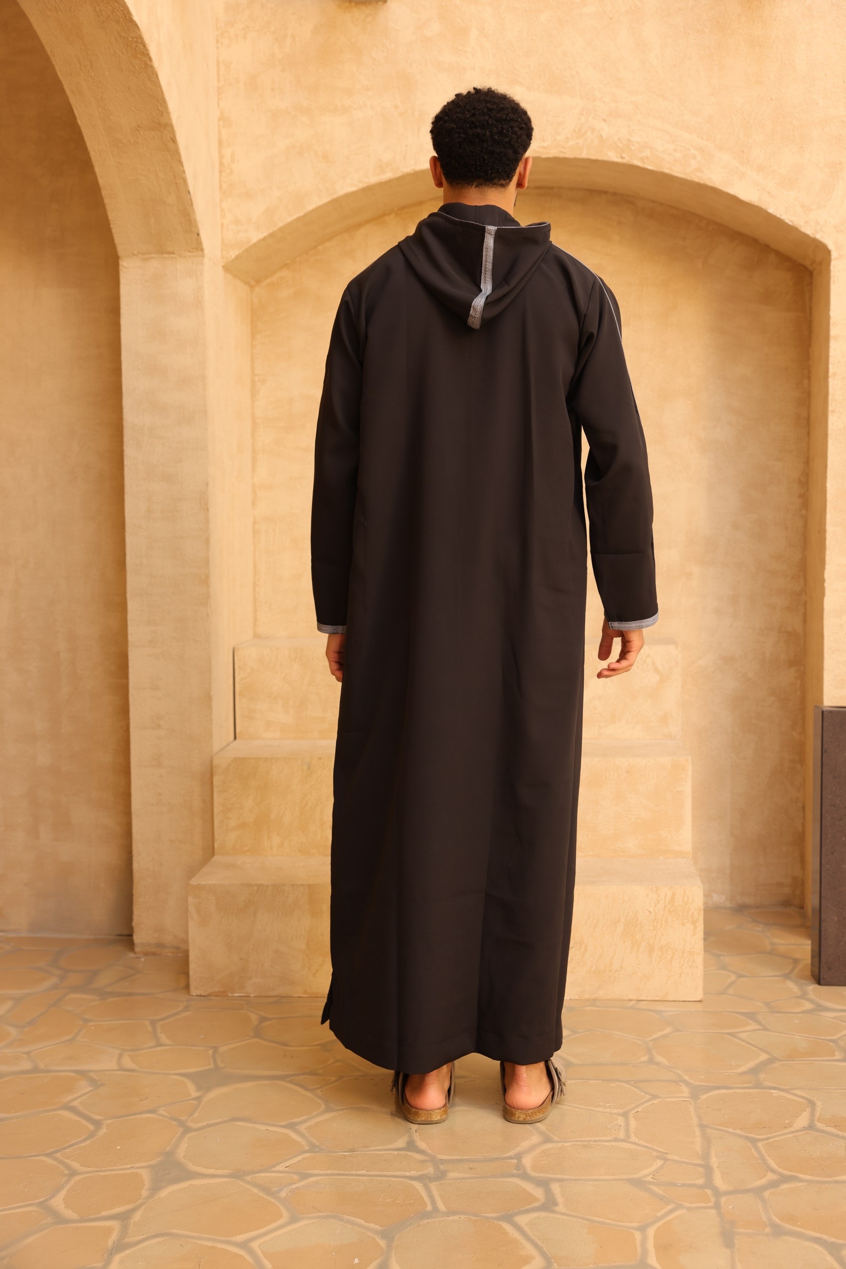 The Qamis Amir Hooded Thobe is an essential piece for the modern gentleman, offering a blend of bold style and effortless comfort. This Black Hooded Qamis immediately stands out with its sober, contemporary design.