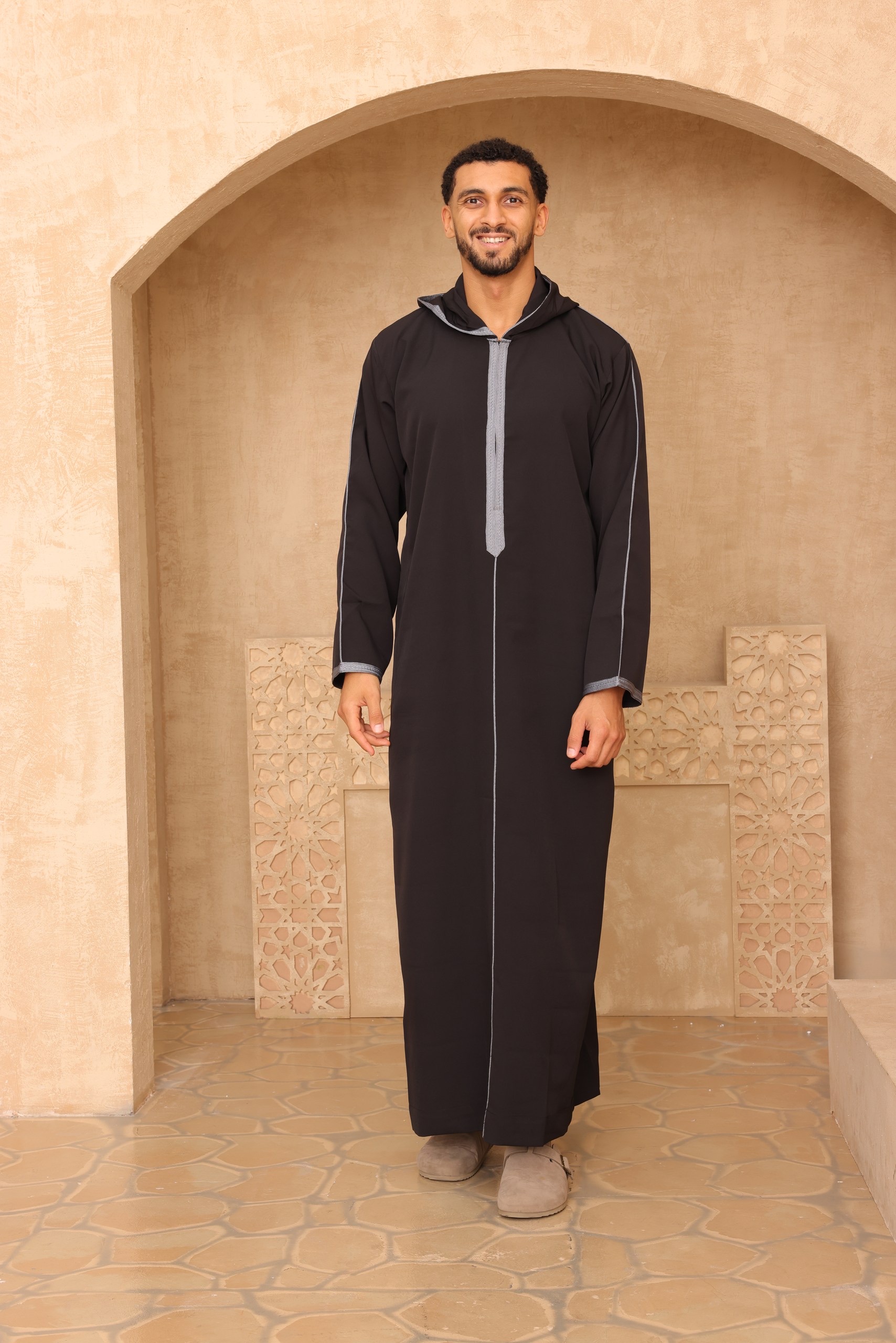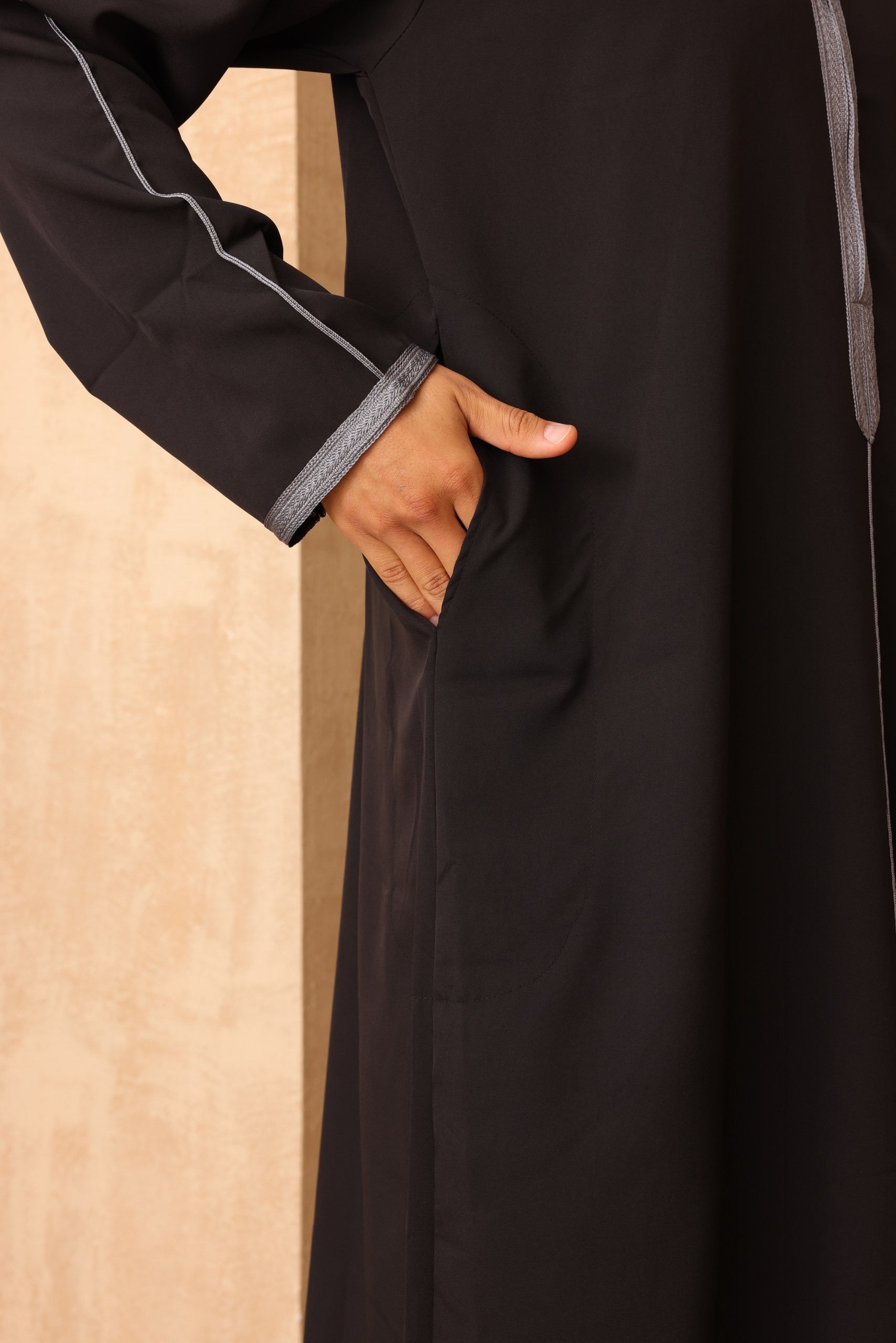 The deep, rich black fabric is elegantly contrasted with grey detailing on the hood trim, placket, and cuffs, lending a refined, stylish edge. This modern aesthetic transforms the traditional Jubba into a highly fashionable garment.