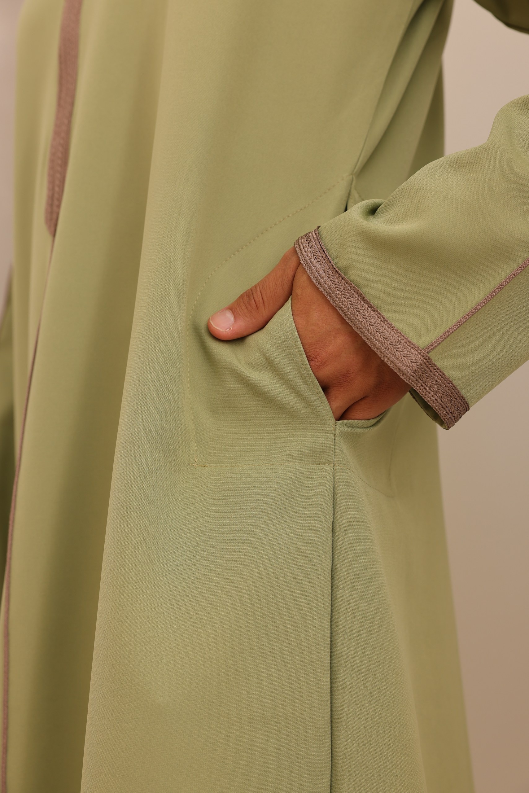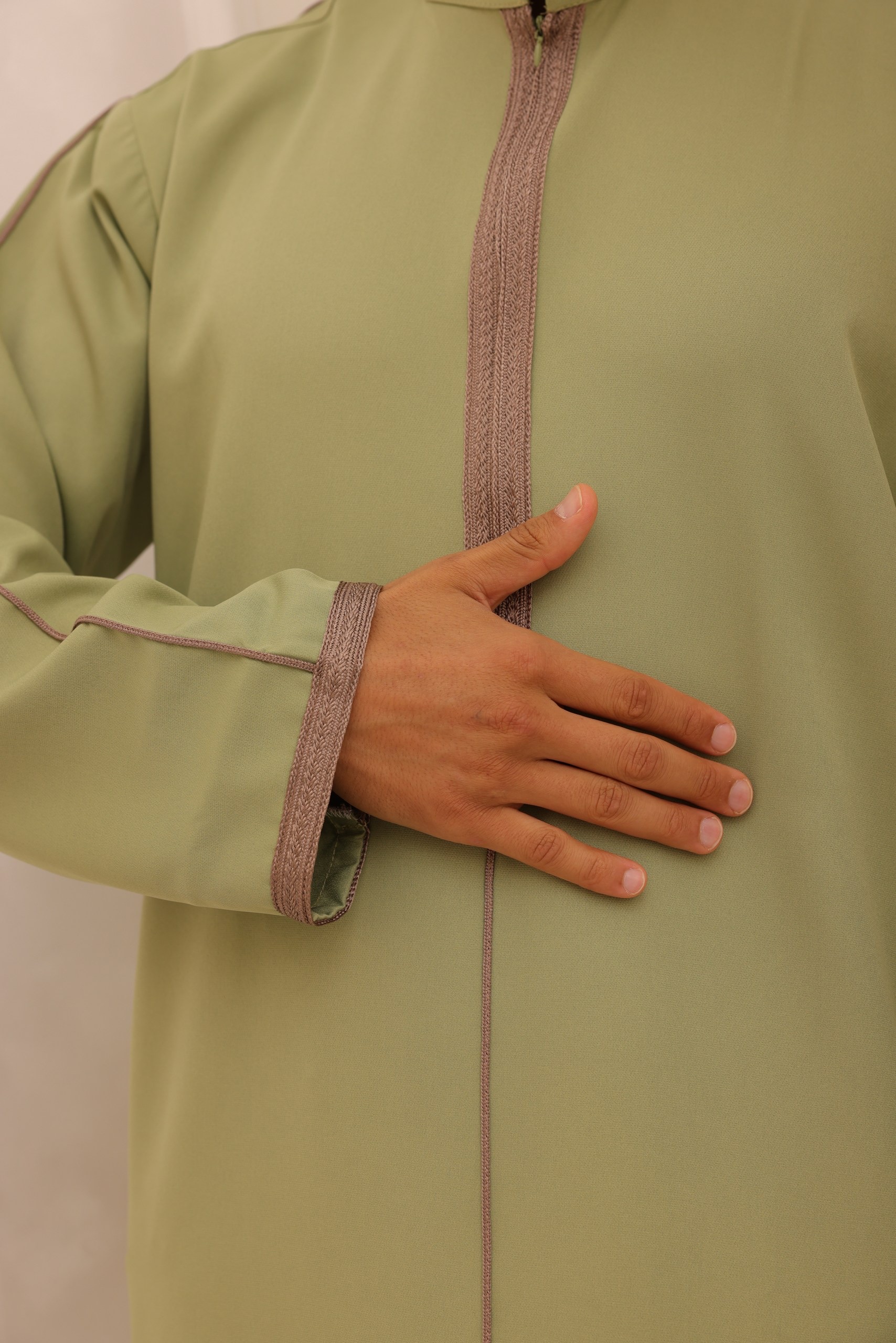 The Qamis Elias introduces a unique shade of elegance to the Men’s Islamic Clothing collection. This eye-catching Olive Green Qamis (Thobe) is defined by its refined hue and delicate taupe contrast detailing, making it a standout garment.